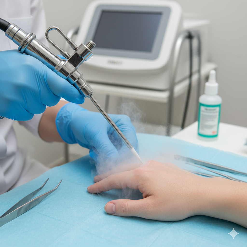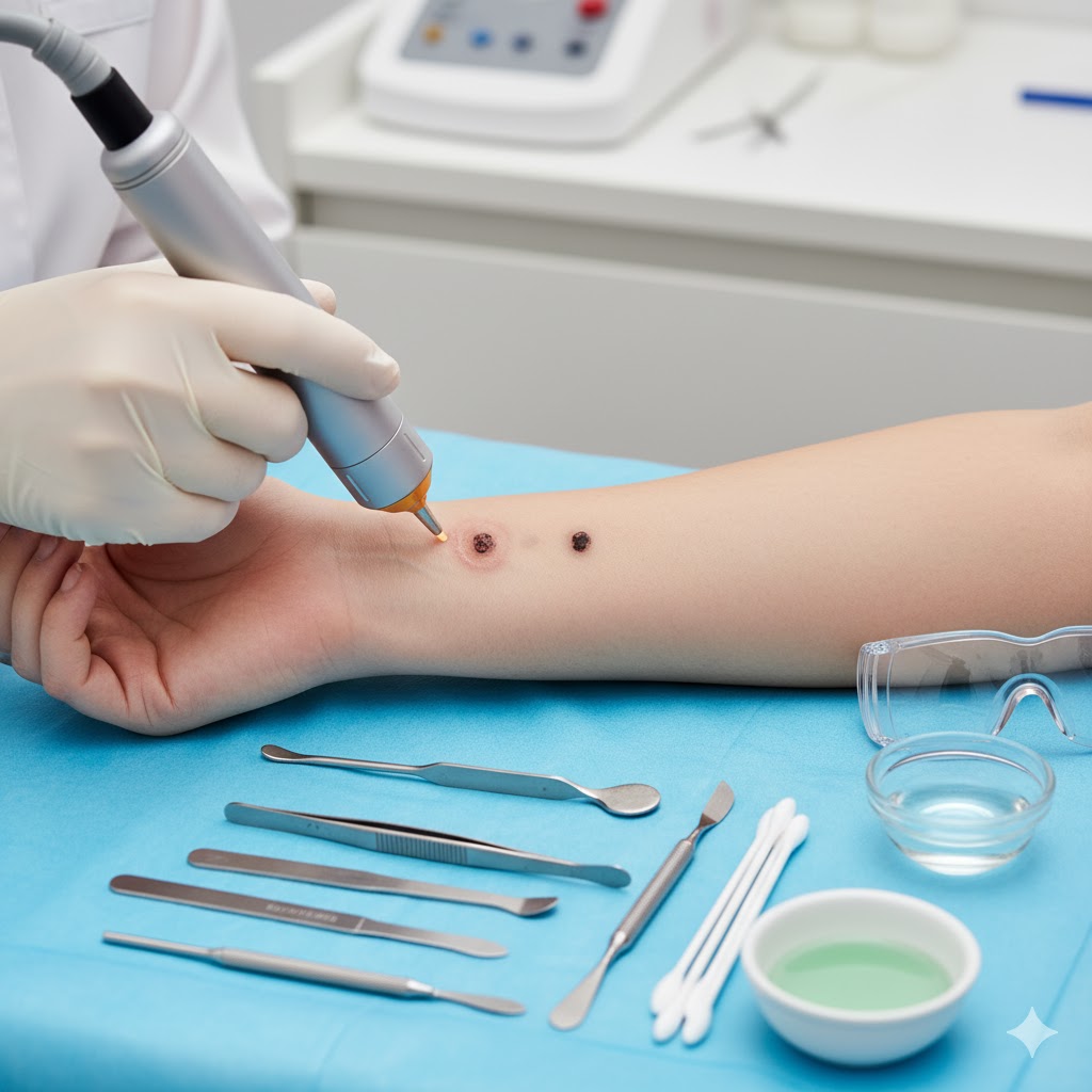 Dermatologie de Précision : Nous réalisons des Ablations Dermatologiques (laser, chirurgie) et la Cryothérapie (azote) pour le traitement des lésions cutanées, assurant des résultats précis et un suivi rigoureux.